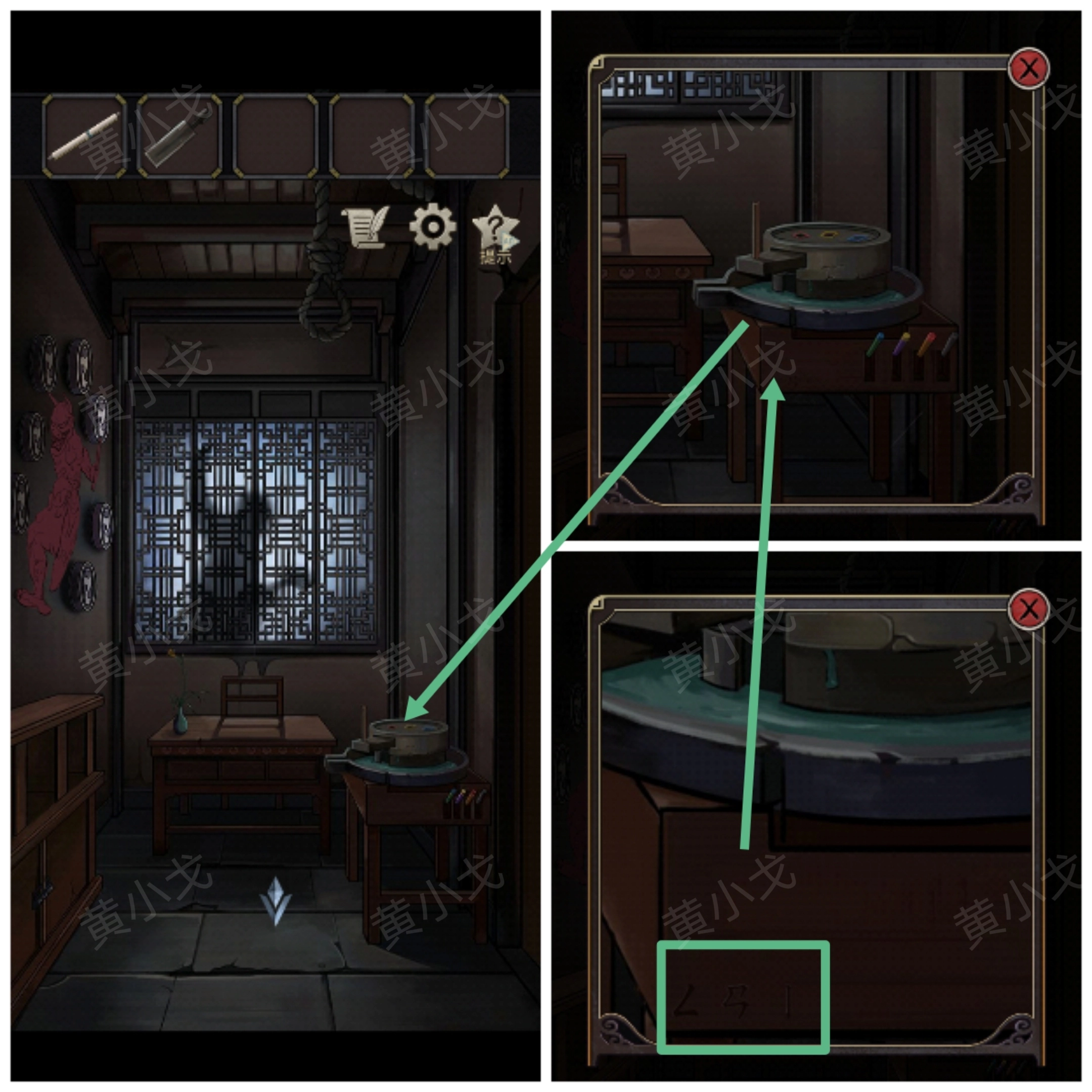 17.(库房)点击石磨下方的桌子,注意上面刻的文字