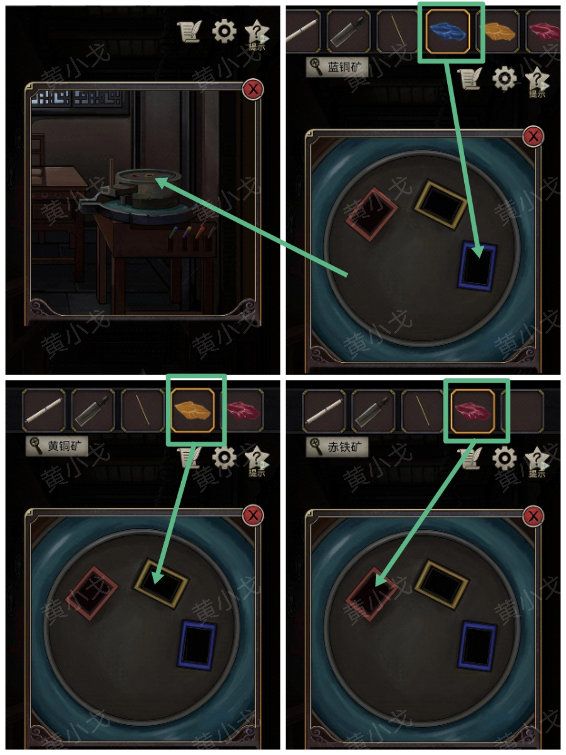 21.点击石磨,把【蓝铜矿】、【黄铜矿】和【赤铜矿】投入对应颜色的口中