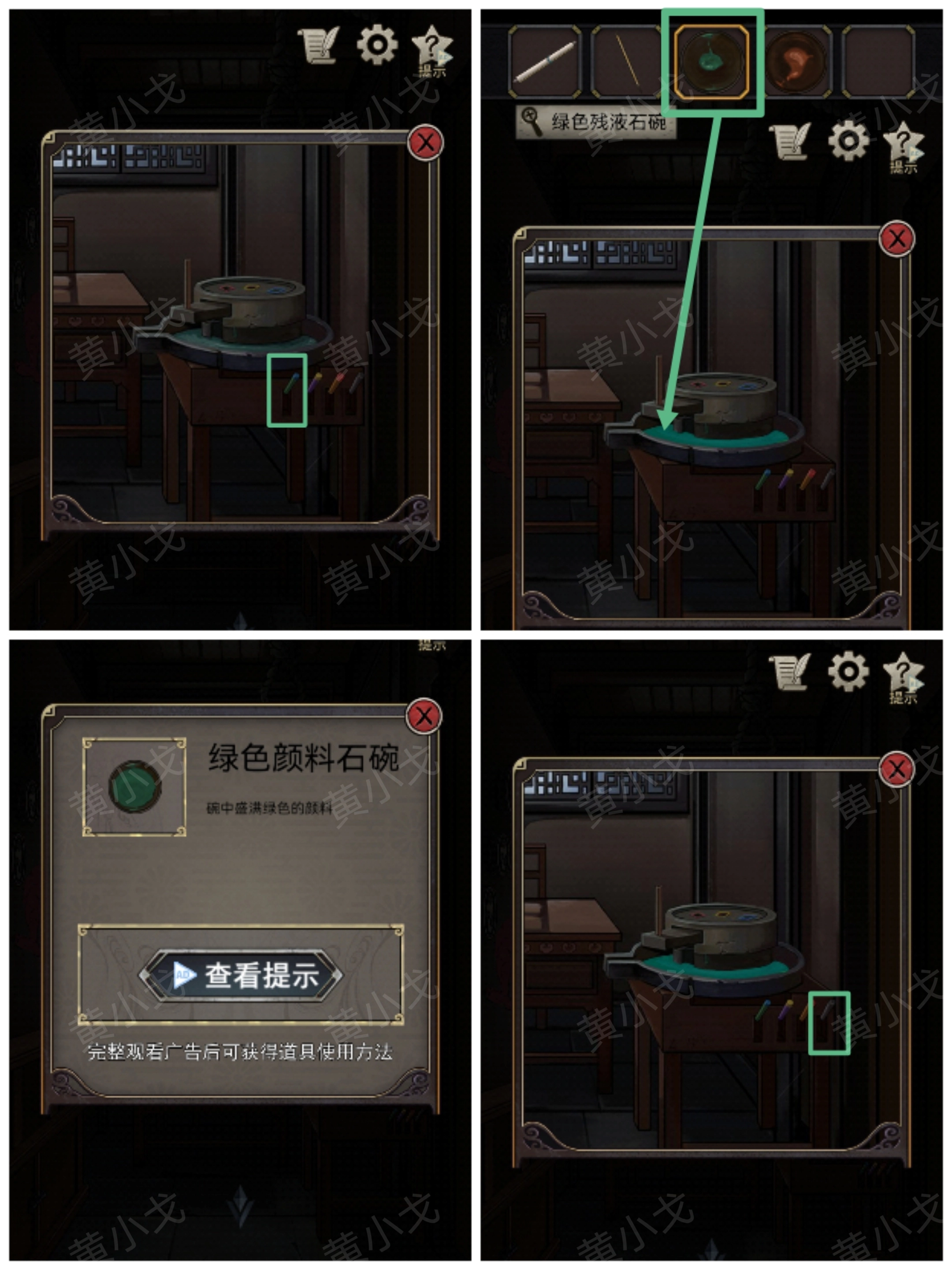 22. 首先拉动绿色摇杆(此为第一个摇杆),接着使用【绿色残液石碗】去装取颜料,如此便能得到【绿色颜料石碗】。之后,拉动黑色摇杆(该摇杆是第四个),以此清空石槽里面的颜料。