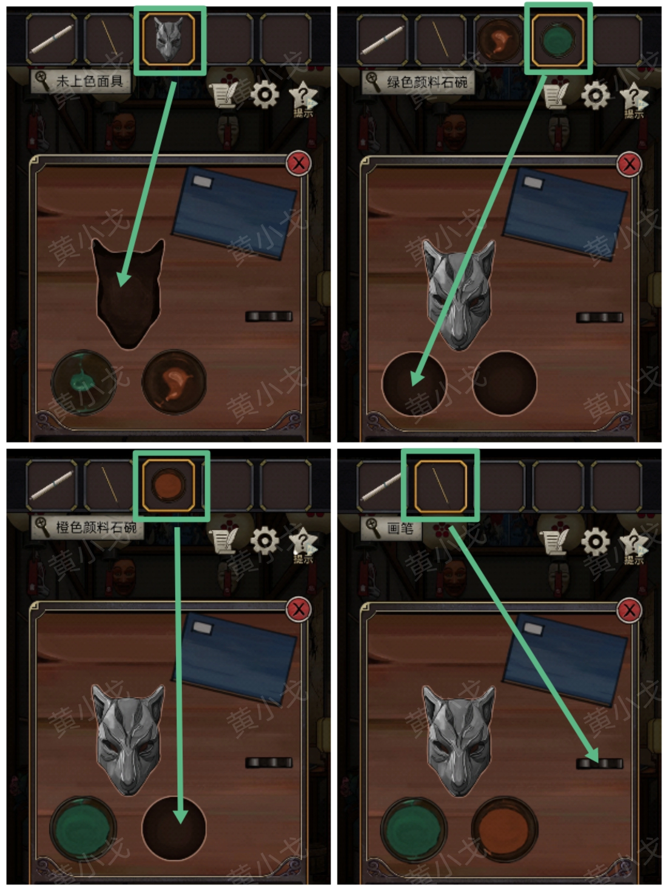 24. 在面具店中,点击柜台,把【未上色面具】、【绿色颜料石碗】、【橙色颜料石碗】以及【画笔】放置上去。