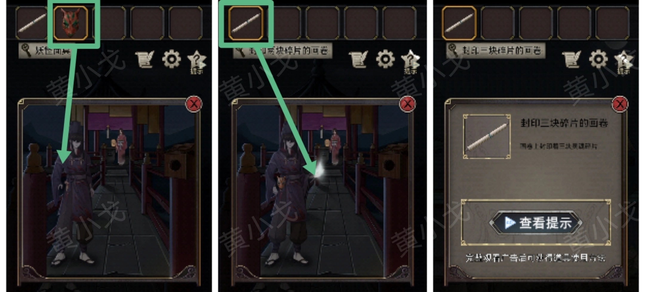27.(在亭子处)把【妖怪面具】递给鬼使;接着拿出【封印两块碎片的画卷】来收集灵魂碎片,随后就能得到【封印三块碎片的画卷】