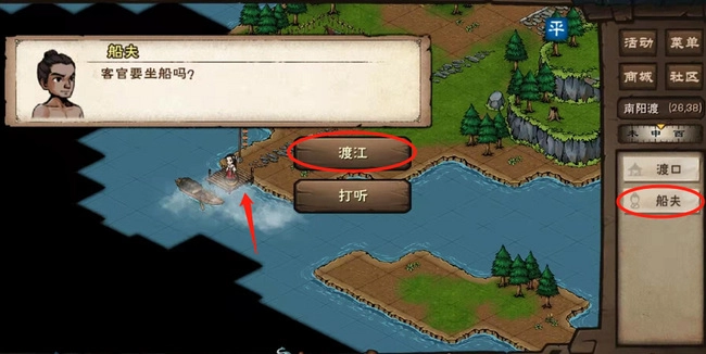 2、抵达南阳渡后,朝着南边前行,来到渡口寻找船夫(船夫仅白天在,晚上不在),与之对话并选择“渡江”。