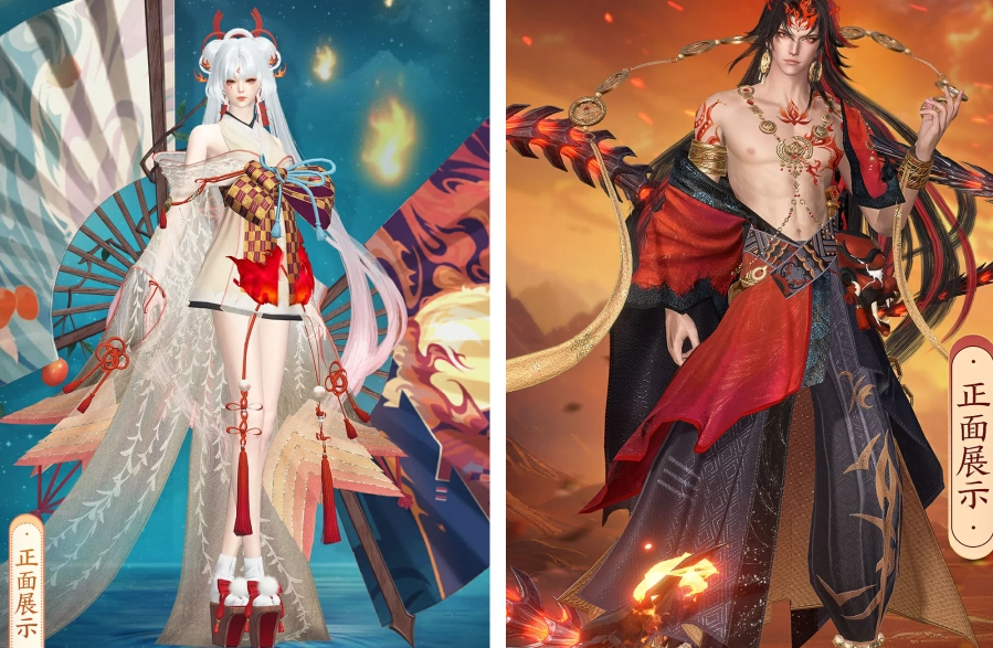 1.【星蝶离火/修罗焚天】:不知火与阿修罗的联名时装,直售价格为2880纹玉。购买该时装可获得专属配饰、精致妆容、群龙之首特效、单人动作特效、变身动作,以及稀有天赏发型【不夜】和【红炎】。