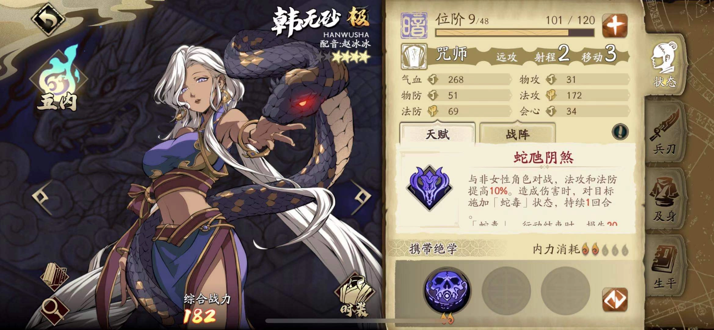 韩无砂定位暗属性法系坦克,不仅生存端较难被针对,其大范围弱化机制在PVP场景中表现尤为强势。搭配万能毒王阵法时,可与解臾、周崇形成良好配合,后续登场的黎幽也与她高度适配。