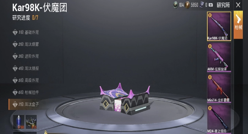 所有枪皮的外观都特别酷炫,配上动态和静态的特殊效果让人看了就忘不了。虽然七级的最终宝盒看起来特别像“骨灰盒”,但勉强也能说得过去。不过除此之外就没什么其他亮点了,关键是98K的出场概率比较低,就跟M24一样,很大程度上都被玩家放在仓库里“压箱底”。