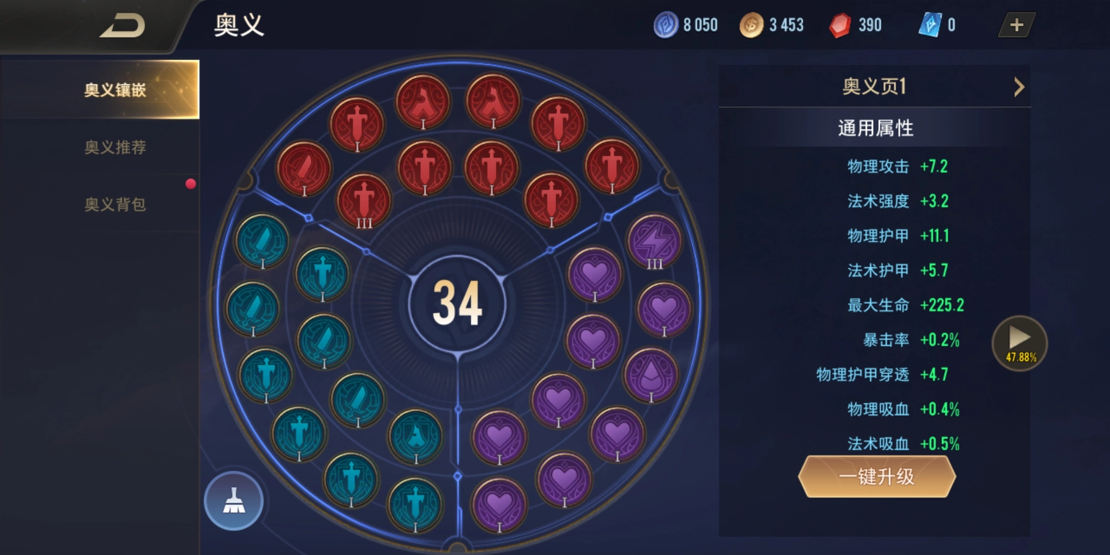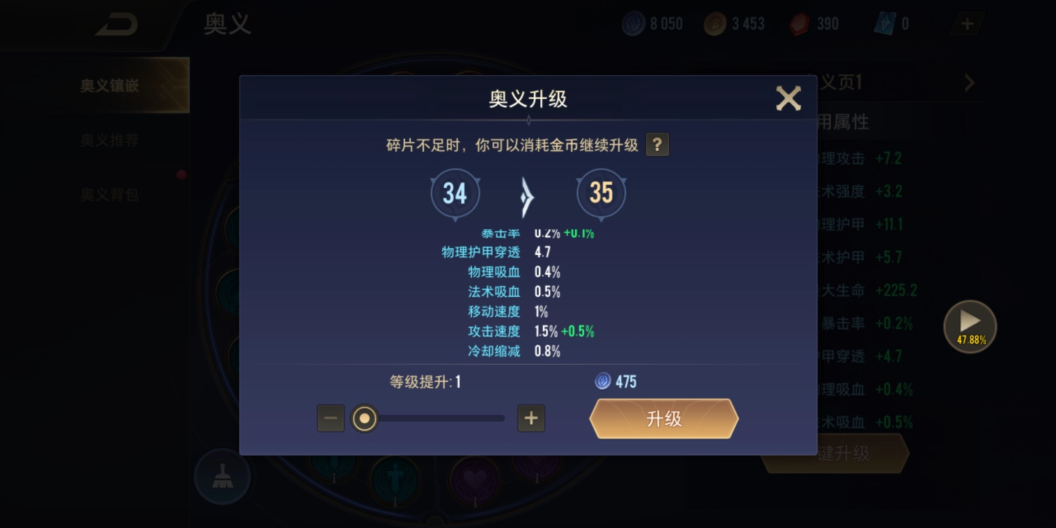 符文的加成属性能够通过升级来提升,完成配置后,点击右下角的键升级选项,系统会自动优先对低级符文进行升级。升级符文需要消耗符文碎片,若符文碎片数量不够,也可以用金币来替代。