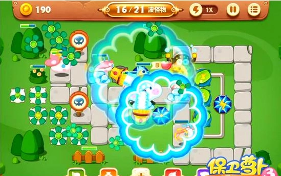 2、中间位置放置两个手电筒和雪花,雪花的作用是降低怪物的移动速度。借助手电筒清除左下角的障碍,就能得到四个风扇,之后可以适时进行升级操作!