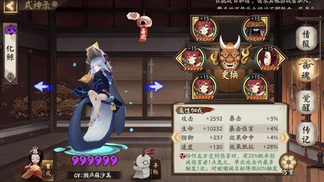 在这个阵容里,不知火推荐搭配“生攻爆伤”属性的地藏御魂套装,暴击属性堆到70%左右即可;化鲸则需要追求极致的速度,越快越好,246号位建议选择“速攻生”的御魂组合(因为齿甲技能存在伤害上限,需要依靠化鲸自身来补充攻击面板),可选的御魂类型包括招财猫、返魂香、木魅、地藏像、剃魂等。