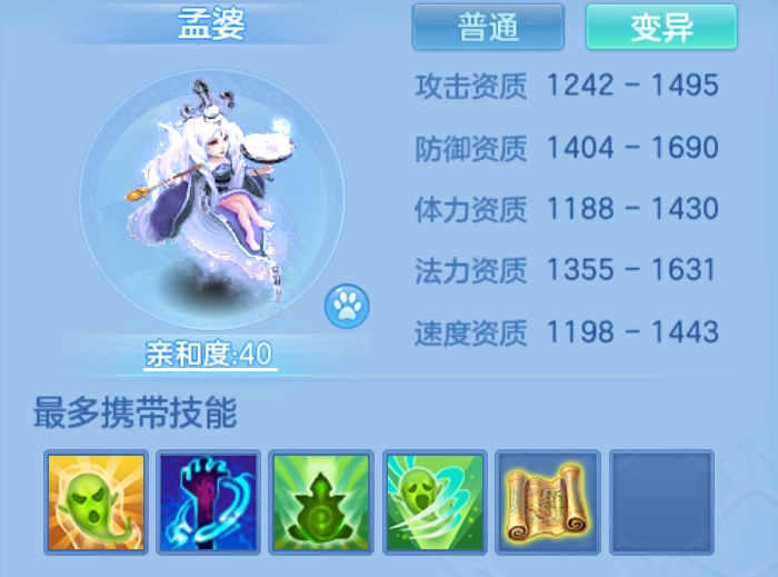 打书方面主要选择高强壮、高保命、高法连、高法爆、大法、高防御,护符则搭配高勇敢或者高级毒——由于耐法宠的数量增多,毒的重要性正逐步提升。这样打书的孟婆面板属性相当出色,而且随着等级提升,灵力也能稳步增长,这也是当前孟婆最主流的打书方案,同时属于高等级法宠里最常见的打书配置。