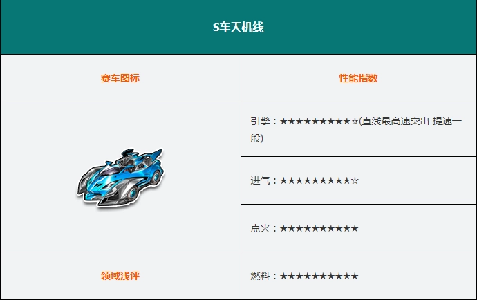 天机线的速度处于中端水平,集气性能出色,车体外观尚可,冲刺时的视觉效果也颇具特色。作为中段S车,它的不足之处在于车体略显沉重,喷气过程中车身转向幅度不大,尾部设计也不够亮眼。不过其集气能力依旧亮眼,综合性能表现稳定。