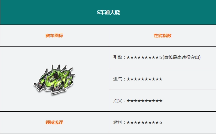 通天晓是阿尔法的升级款赛车。它速度更快、集气效率更高,但操控触感上没有特别突出的表现,属于速度型S车。车身通体翠绿色,车体小巧,驾驶起来仿佛能让人感受到风的流动。