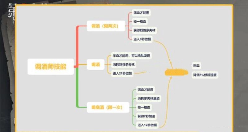 调酒技能会让满血的调酒师丧失一格生命值,在8秒后,调酒师复原为满血。当调酒师获取一瓶烈酒时,会永远减少8%的修机速度。而且,调酒的过程必须耗费两秒。
