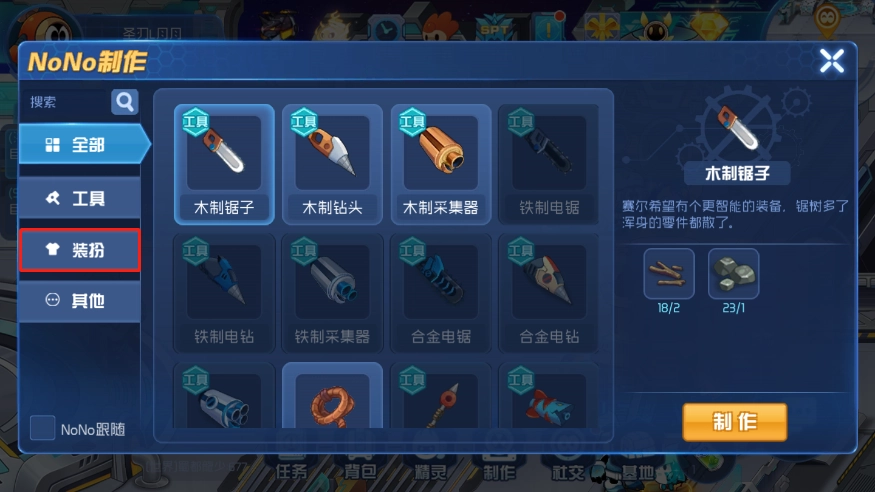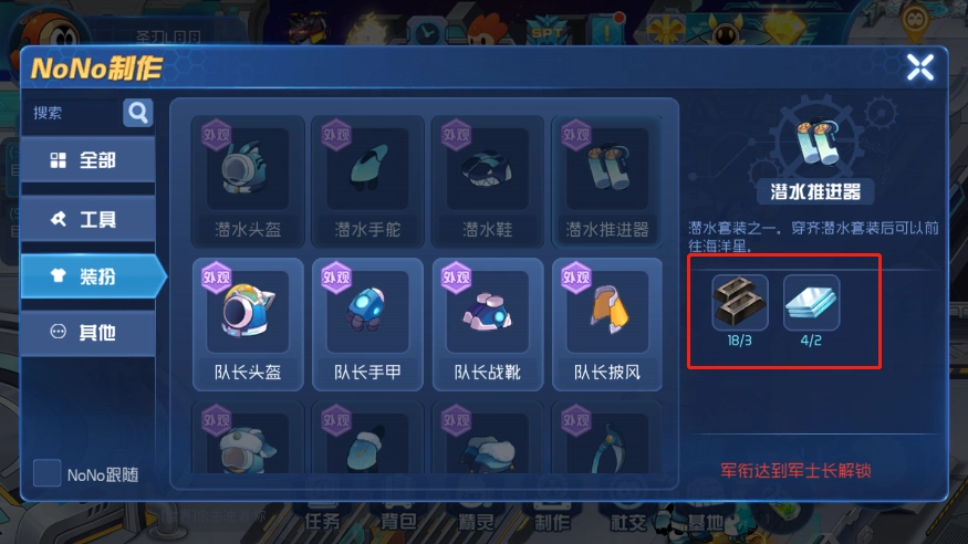 (3)制作步骤:首先进入游戏主页面,点击底部的“制作”按钮。接着点击左侧的“装备”按钮,在材料集齐的情况下,点击潜水推进器就能完成制作。