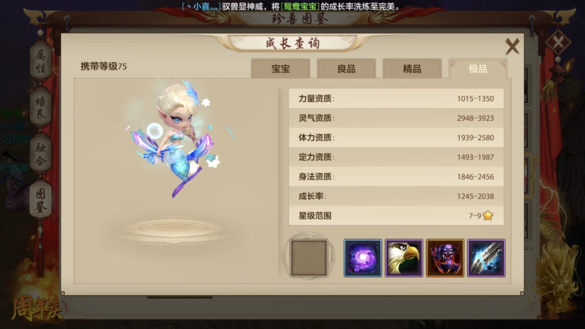 逍遥建议搭配三种属性的宝宝,其中一种是高攻击的内功宝宝,比如人鱼公主宝宝。它的法魂技能能够提升主人的内功攻击,移魂技能则可以增强主人的定力。