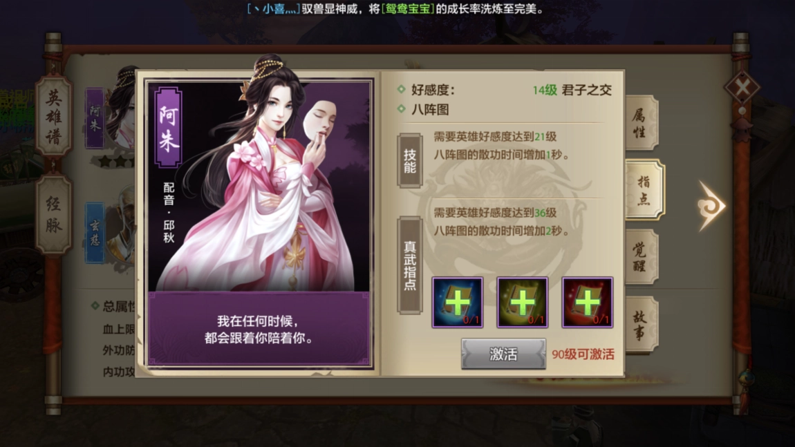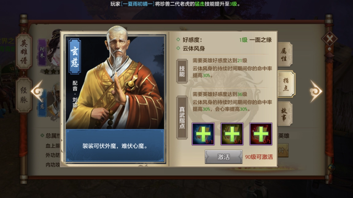 到了游戏中后期,我们就可以用紫色乃至橙色品质的英雄来进行指点了,像阿紫、段延庆、萧远山这类英雄都能派上用场。一旦英雄的好感度达到30级,就能助力角色打通经脉,进而提升整体战斗力。
