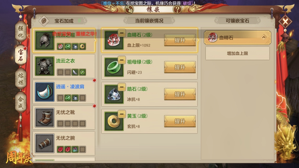 逍遥作为远程内功职业,其核心特色在于厚积薄发,而使用火攻击能够最大化提升他的伤害输出。因此,在镶嵌宝石时,我们需要选择红晶石与红冥石,同时搭配提升命中和会心属性的宝石。