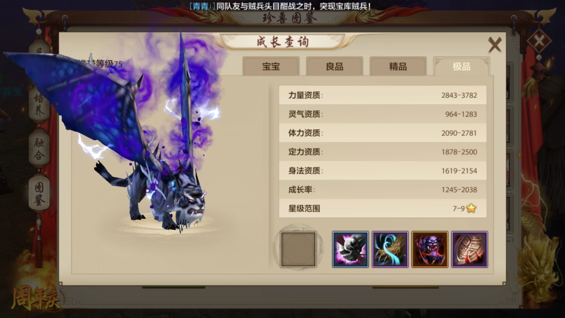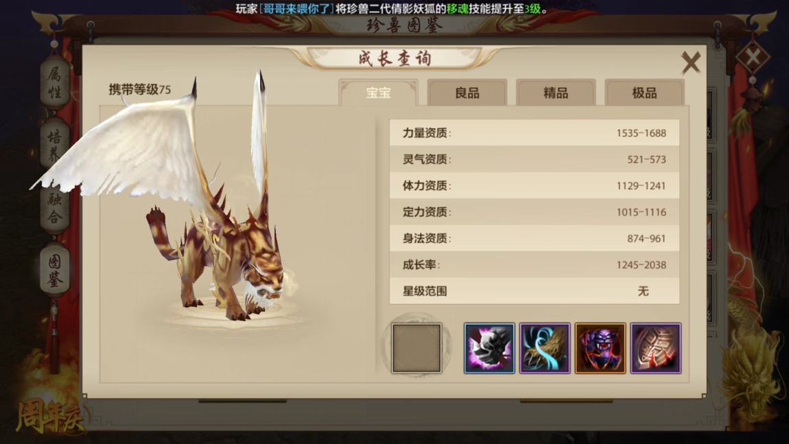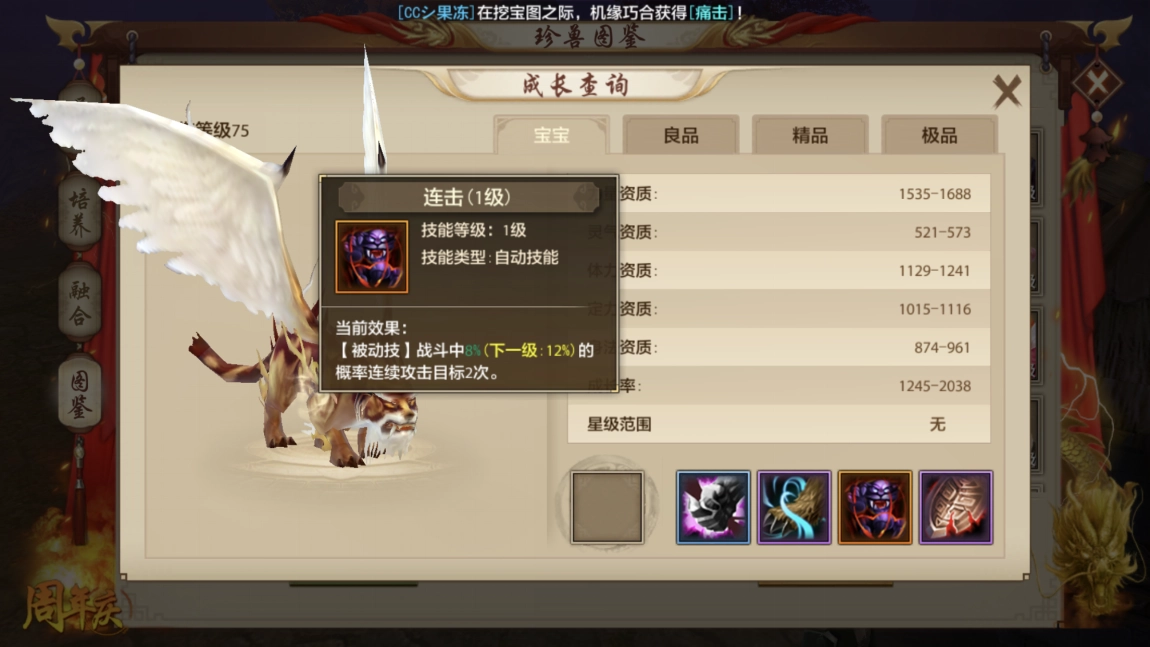 如果我们攻击力偏高但防御力不足,不妨培养一只穷奇外功宝宝。它的破绽技能能降低目标的内外防御力,连击技能还能大概率对敌人发起两次连续攻击呢。