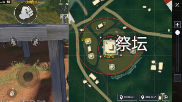 从资源分布的角度,我们可以将祭坛划分为A、B两个区域。A区域的核心是落点中心的大祭坛,B区域则涵盖了祭坛外围的小建筑群。大祭坛内部共分为三层,每一层都会刷新物资,并且有较大概率出现高级物资。B区域的物资储备同样能够满足日常装备需求,不过由于建筑分布较为零散,需要花费更多时间逐步搜集。