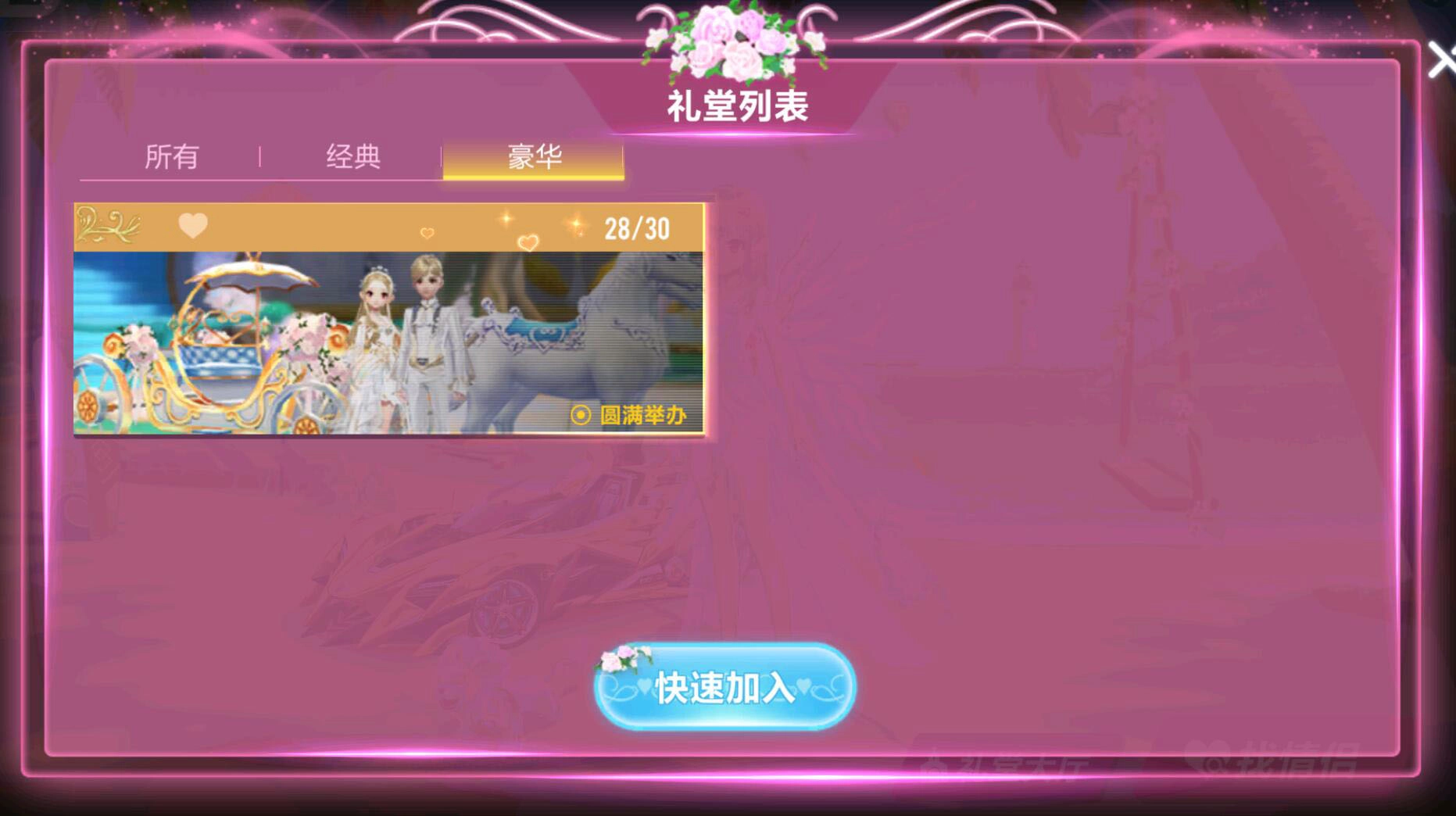 礼堂大厅是用于观摩其他玩家婚礼的场所,若想自己结婚,则需点击“找情侣”功能。