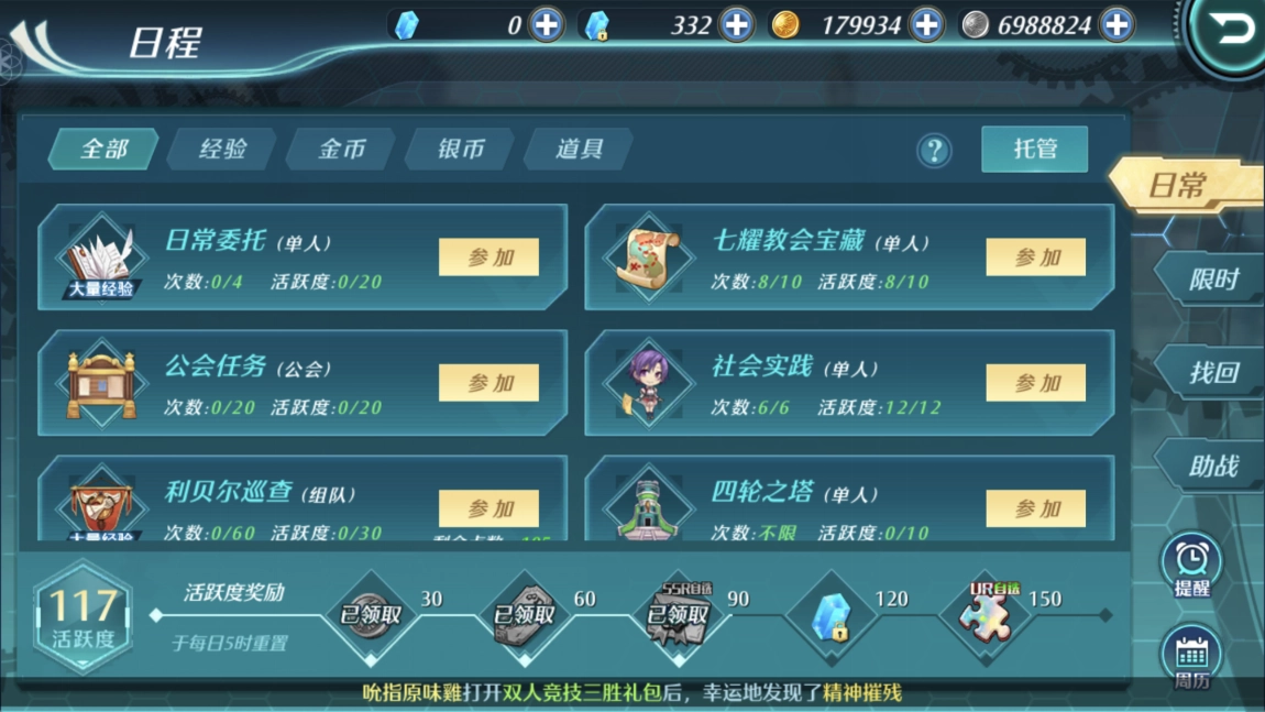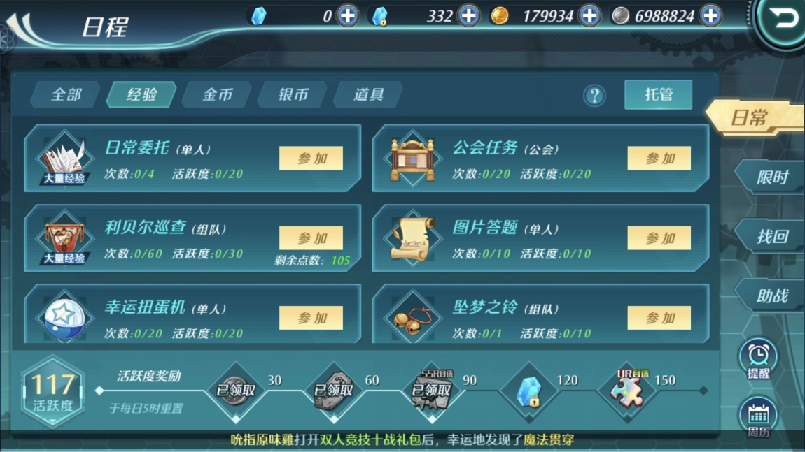 日常任务包含日常委托、教会宝藏、公会任务、社会实践、利贝尔巡查、四轮之塔等类型;而限时任务则有公会寻宝、野外boss、地区巡逻、紧急军情等,这类任务仅能在特定时间段内参与。