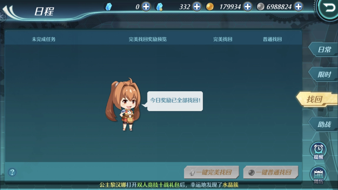 要是我们没完成任务,第二天还能进行任务找回。任务找回有普通的银币找回,这样能得到大量任务经验;另外也可以用水晶找回,这种方式不仅能获取经验,还能拿到任务物品奖励。