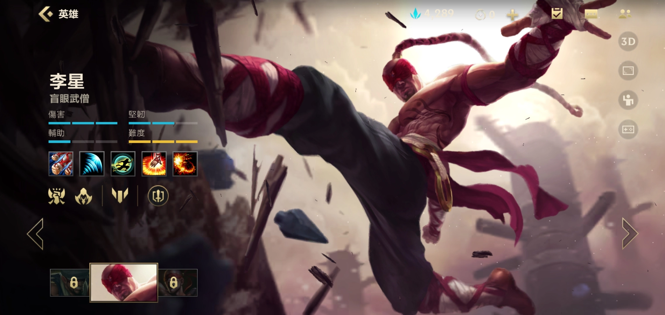 盲僧在当前版本依旧是强势打野,其前期制造机会的能力尤为突出。三级后的盲僧可以主动入侵龙女的野区进行骚扰,毕竟龙女的强势期要等到五级解锁大招后才会到来。所以我们可以选用盲僧,利用己方的强势阶段去针对对手——尚未达到五级的龙女,在正面对抗中是绝对不敌盲僧的。