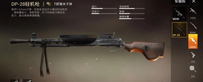 再来说说DP-28,这把枪也有个绰号。因为它的弹夹外观很特别,像个盘子一样架在枪身上,所以网友们都叫它“大盘鸡”。在伤害性能上,使用7.62mm子弹的DP-28有着先天优势,实际表现也确实如此——虽然它的射速不如M249快,但伤害比M249略高一些;要是不考虑射速的话,DP-28的伤害优势就更明显了。不过它的弹夹容量只有M249的一半左右,只能装47发子弹。配件方面也比较受限,只能安装倍镜,其他类型的配件都无法使用。