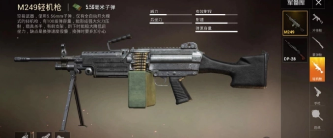 先来说说M249,它有个“大菠萝”的绰号,这外号的由来,正是因为它那超大的弹夹容量——足足能装100发子弹,这让无数载具都对它忌惮不已,所以也被称作“载具杀手”。作为空投专属的武器,它的身份可不一般,而且只能装配倍镜。伤害向来是衡量武器强弱的关键标准,虽然使用5.56mm子弹的M249伤害不算特别高,但它超快的射速弥补了这个先天不足,照样能打出爆炸般的输出!