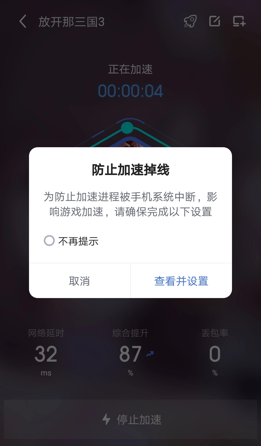 在使用加速器的过程中,会弹出一个显示防掉线设置的窗口,建议玩家务必配置好这个防掉线设置,如此能够确保加速器运行得更加稳定。