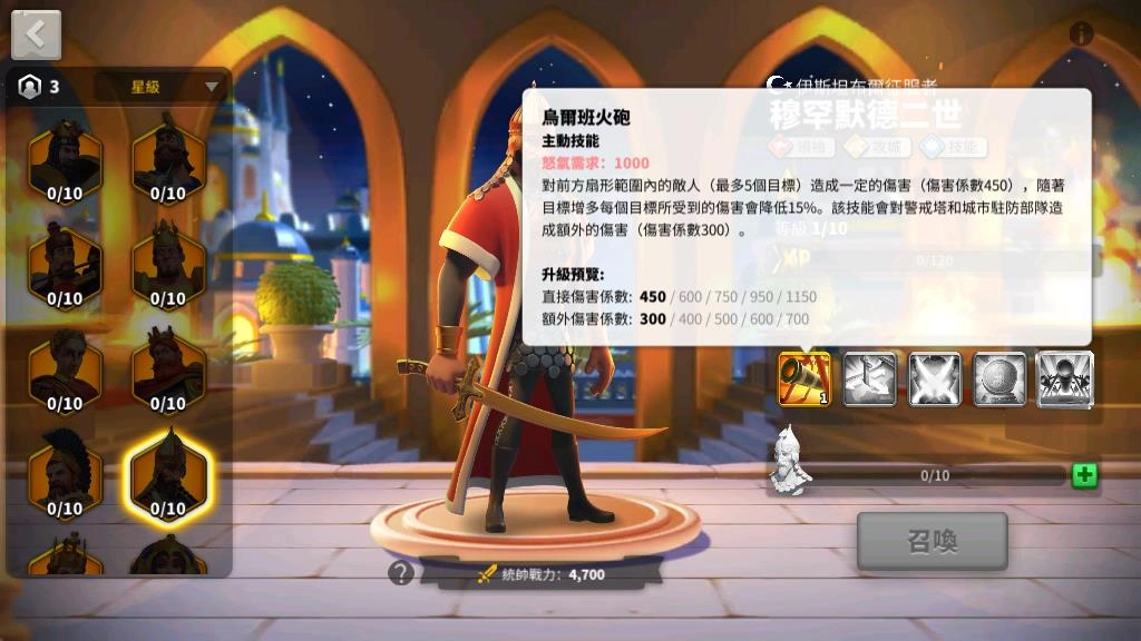 主动技能“巨炮阵”释放后,会对前方特定范围内的敌人造成伤害,此伤害与穆罕默德二世当前所带部队数量存在关联,最高能提升20%的伤害量。若该技能的目标是警戒塔和防御建筑,还可产生一定的额外伤害。从这个技能不难看出,穆罕默德二世在攻城玩法里具备相当出色的能力表现。