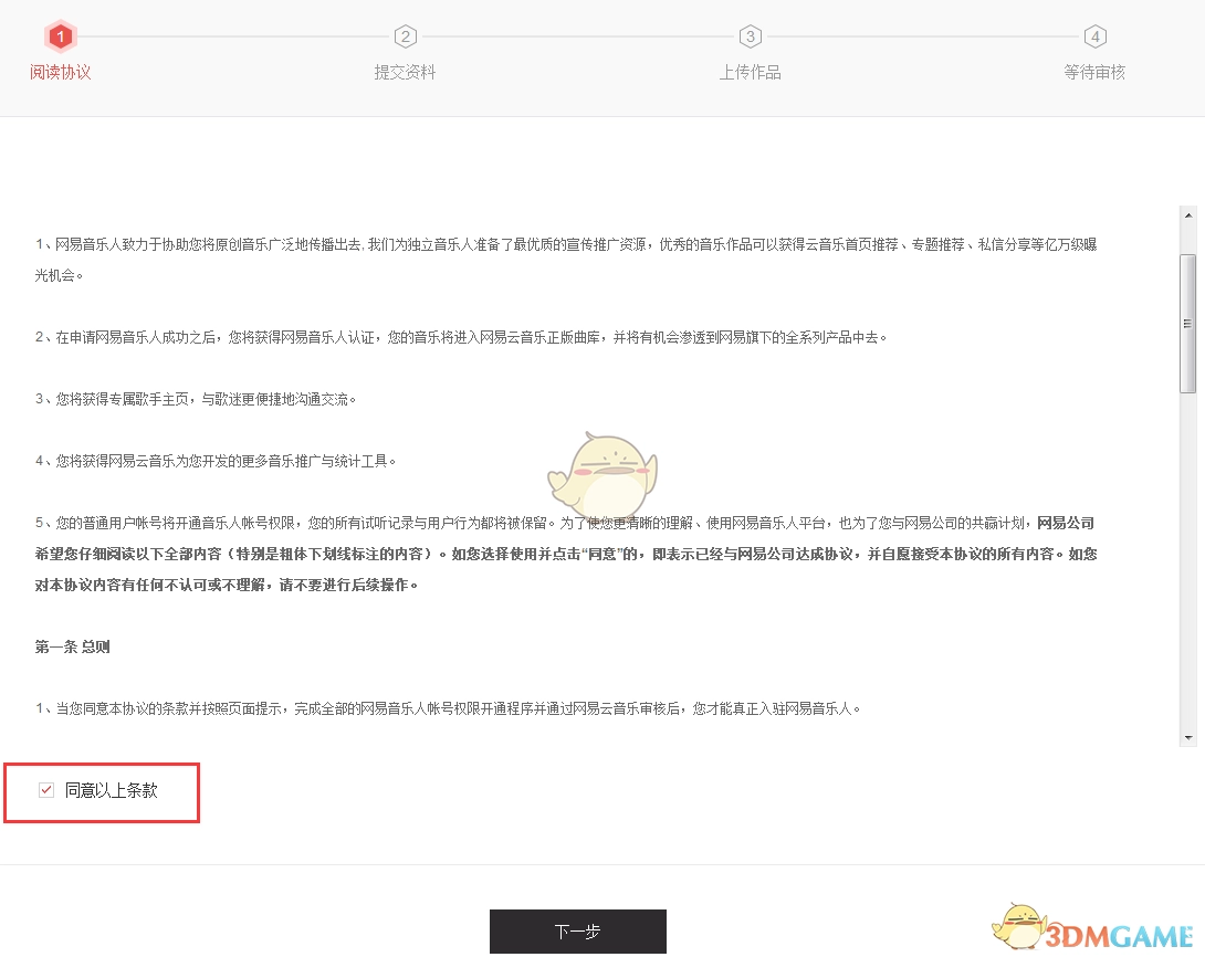 2、点击“立即入驻”后,系统会提示阅读协议。阅读完成,若觉得没问题,就勾选左下角的“同意以上条款”,接着点击“下一步”。