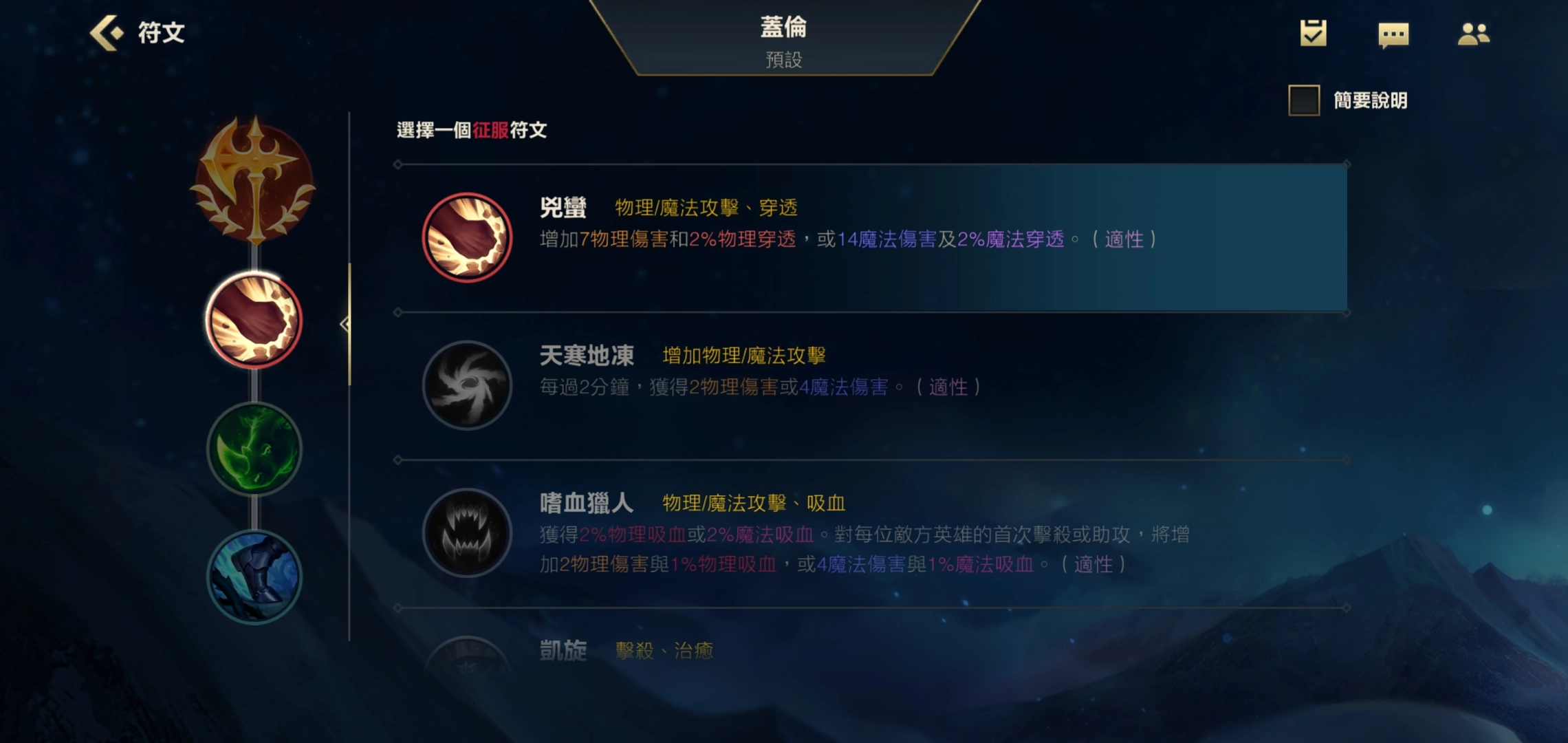 盖伦在主系天赋的选择上,有两个比较适配的选项。第一个是征服者,不过盖伦要在团战里叠满征服者的被动并不容易。但一旦叠满了,他的E技能在团战中就能转出更可观的伤害,而且触发征服者后,盖伦的伤害会提升10%,大招的斩杀伤害也会随之提高,对敌人的斩杀线自然也更高。总体而言,征服者是很适合盖伦的攻击型天赋。