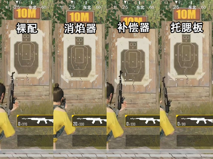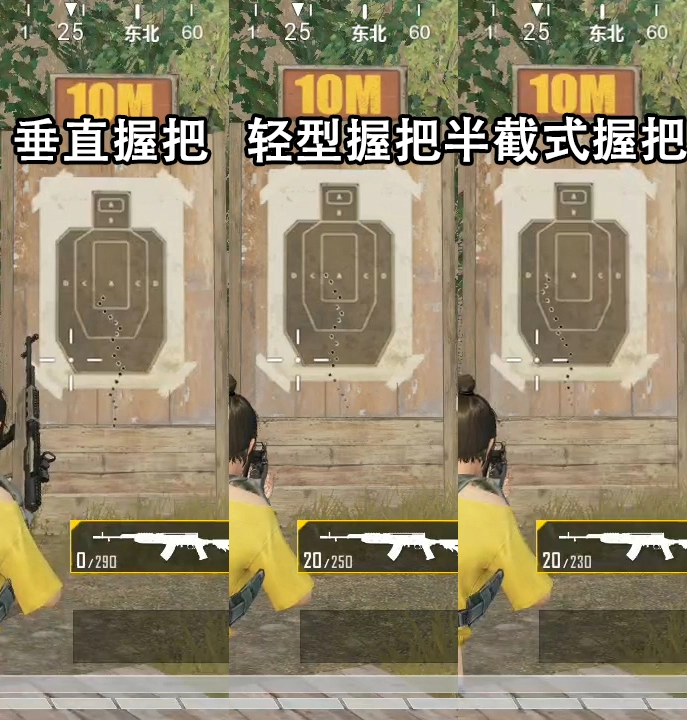 装配垂直握把后,垂直方向的后坐力会有所降低,但效果不如补偿器显著。半截式握把与轻型握把的弹道表现十分相近,二者都能减少部分垂直后坐力,从弹道图上难以看出明显差异。