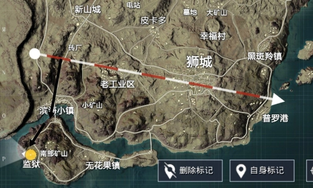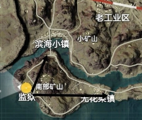 比如图中的航线,要是没办法直接飞到监狱,就可以在黑色箭头的起点处跳机,接着顺着通往滨海小镇的公路飞行,等飞到最远的距离后就打开降落伞降落到地面,再在附近找交通工具去监狱。找交通工具的时候也要留意自己选的路线,要是路线全程都是公路,那二轮摩托车和跑车就是很好的选择;但要是得经过南部矿山,建议选沙滩车来当代步工具。