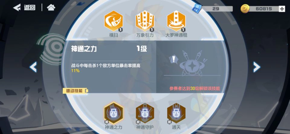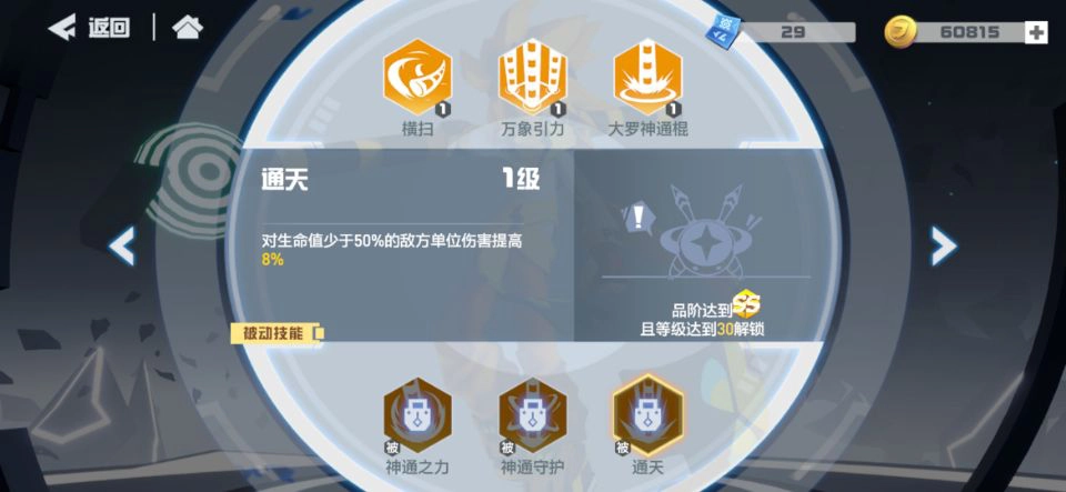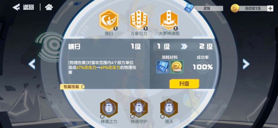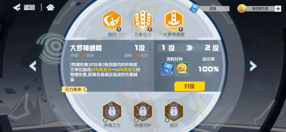 大招的攻击范围从十字格拓展到两格内的全域,而且离自身越近伤害越高,能配合走位释放,在敌方boss面前使用效果特别好。被动技能的第一个是增加自身暴击率,似乎用棒子的角色都很擅长暴击,这意味着它拥有强劲的输出能力。