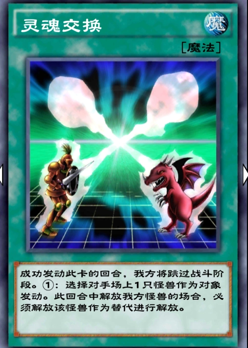 在海马预组里,灵魂交换这张卡同样很好用。当玩家想召唤青眼白龙,可场上只有少量祭品时,就能发动这张卡,让对方的怪兽充当祭品。如此一来,既能成功召唤青眼白龙,还能减轻玩家场上的压力。