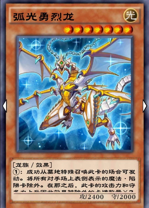 除了这种方法外,玩家还能借助弧光勇烈龙的效果来召唤青眼白龙。不过需要先让青眼白龙进入墓地,之后让弧光勇烈龙在墓地中发动自身效果,将青眼白龙召唤到场上。