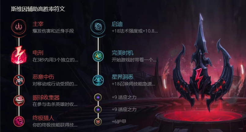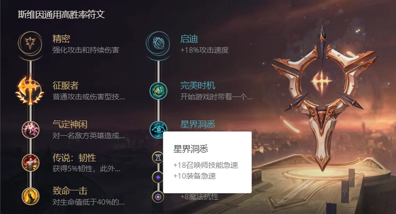 另一种天赋搭配是主系选择征服者,副系点出启迪。和电刑相比,征服者更偏向后期发力,触发条件也更为严格——要是说电刑走的是极端爆发路线,那征服者就显得相对保守。乌鸦作为辅助,后期偏向法坦定位,所以肉装配合征服者能让他更稳定地持续输出。不过这个组合的短板在于前期线上需要抗压,即便有机会也难以打出理想的伤害,算是个中规中矩的天赋选择。如果下路搭档的是软辅,用电刑无疑能打出不错的爆发效果;但要是遇到硬辅,就得靠更快地用技能叠加征服者层数,才能实现更好的输出。当然,面对不同的对线对手,天赋选择也得灵活调整,关键还是要根据实际情况随机应变。