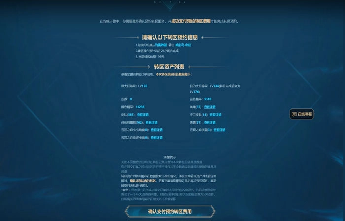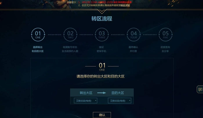 转区过程中会出现相关提示,具体分为五个步骤:首先选择需要转出的大区和想要转入的大区,接着系统会对当前账号状态进行检测,同时查看其他转区的预约人数情况,之后验证绑定的密保手机,再确认完成付费操作,最后就能查询转区的进度了。
