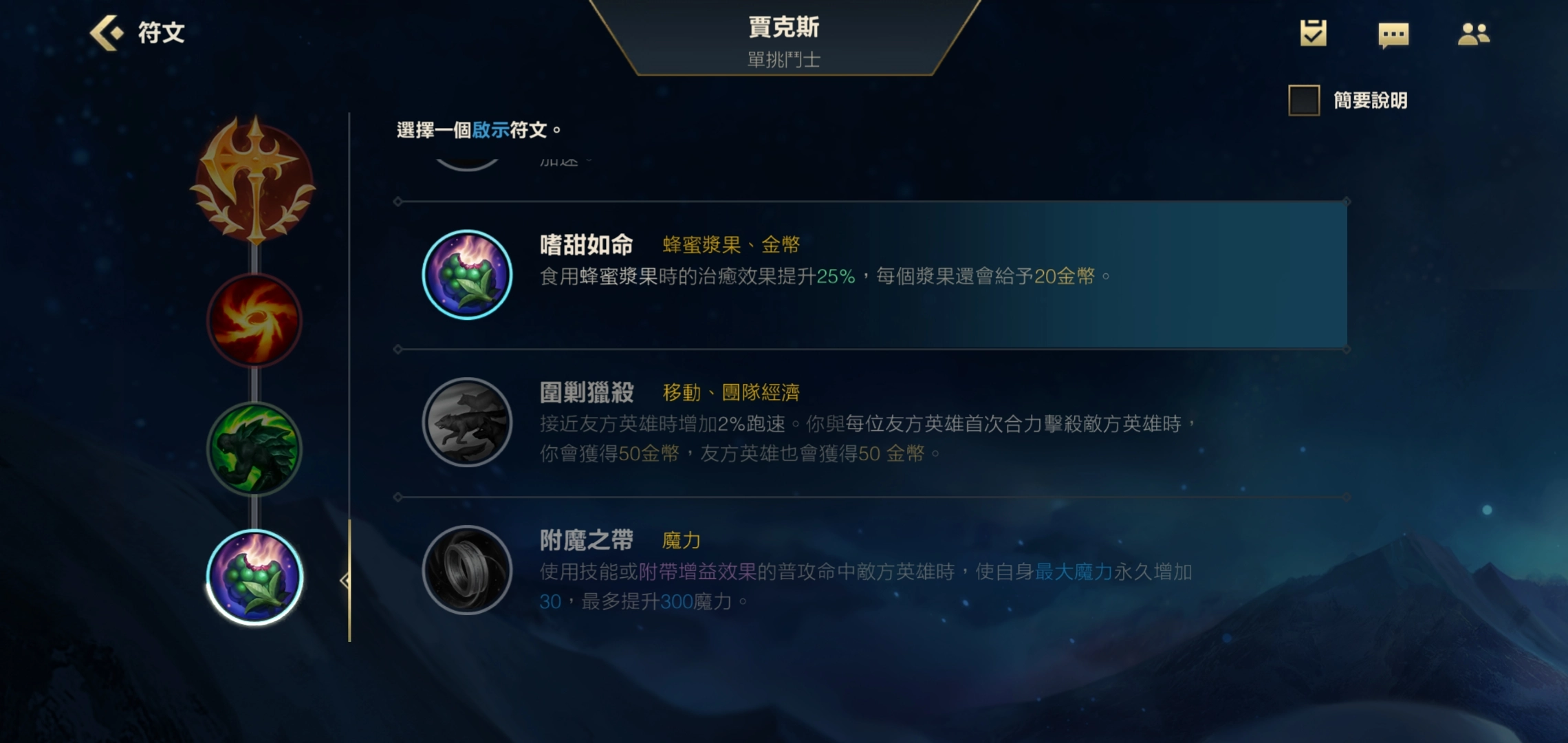 以上就是关于英雄联盟手游贾克斯天赋搭配的全部攻略啦,各位小伙伴可以根据对局的实际情况来选择不同的天赋组合哦。