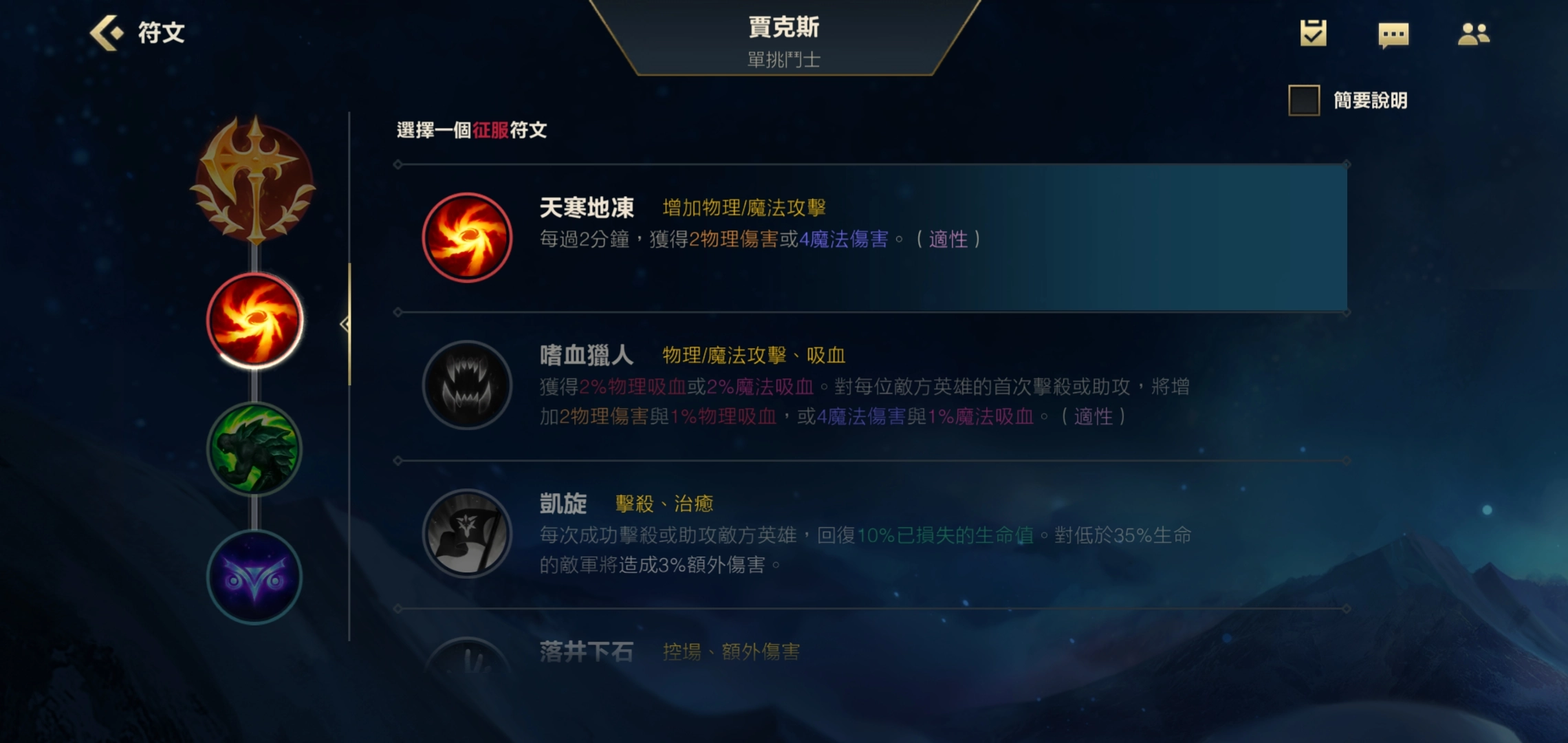 武器的主系天赋最好选择征服者,征服者的攻击加成被动对贾克斯来说十分适配——贾克斯开启E技能时能规避敌人的普攻伤害,在技能持续期间,大家可以持续用普攻攻击敌人,以此来叠加征服者的被动层数。