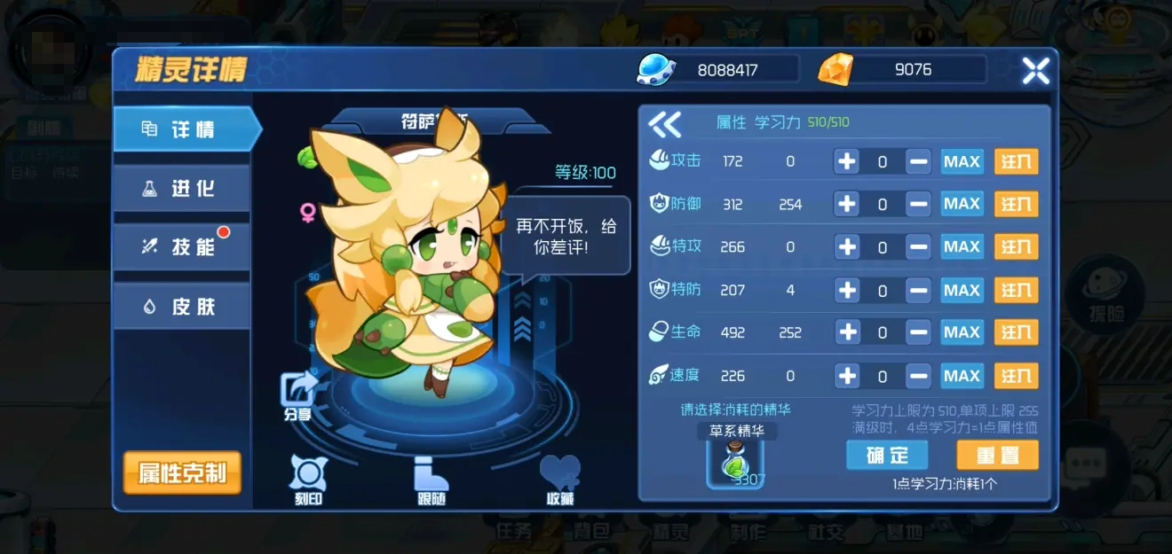 2、配点时速度值没什么用,建议优先选择防守反击的思路,生命原力的强化效果完全能支撑输出需求。草兔子这个精灵实用性很高,不管是在竞技场还是副本中都有不错的价值。