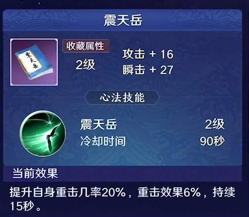 4、震天岳:提升自身猛击概率20%,同时附加6%的额外猛击特效,效果持续15秒。