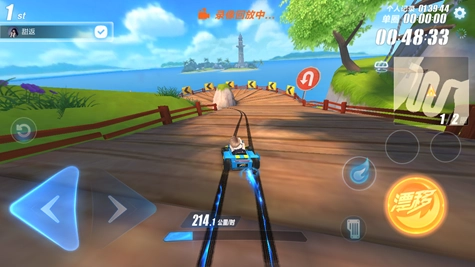 驶过两座大桥后便是连续弯道,这时候我们得在靠近木桥的刹那进行漂移,如此就能防止撞到赛道,还能比常规漂移积攒更多氮气,进而拉开和其他玩家的差距。