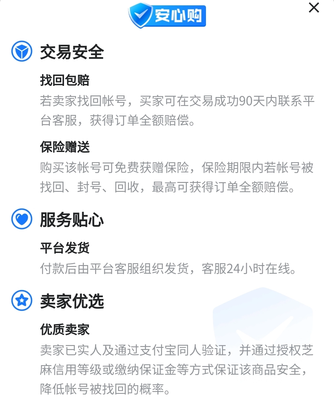 我推荐交易猫平台的核心原因在于它的安全性表现突出。在平台上,买家可以清晰地了解到商品所包含的各项服务保障,同时也能查看卖家的芝麻信用情况。我还建议大家优先选择带有“安心购、保险赠送、找回包赔……”这类标识的商品,这类商品的售后保障更加全面,购买账号时能让人更放心。