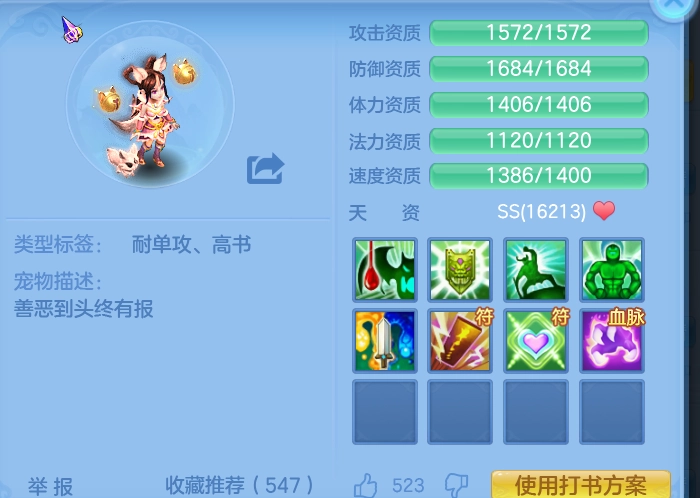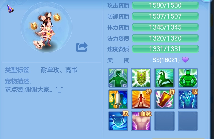 先聊聊狐狸最主流的耐单攻打书方案。我推荐的搭配是高吸血、高防御、高勇敢、高强壮,再加上它的特殊技能。这五本书虽然没有克制技能,但基础的血耐属性已经很扎实了。护符的选择上,可以考虑高神佑搭配小克制技能,或者高保命配小克制技能。图里这只狐狸的打书思路,就是典型的单克制耐攻狐狸。这类狐狸对防御资质的要求特别高,攻击资质达到1550左右就够用了。