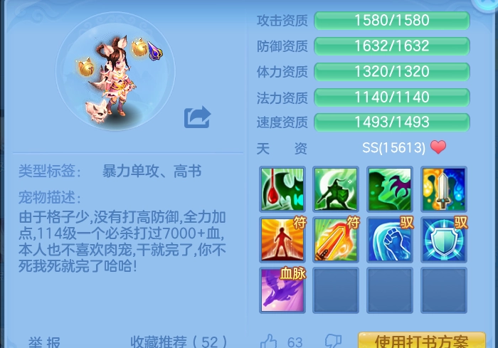 通常走暴力单攻路线的狐狸宝宝,技能配置多为四技能。我在考虑打书方案时,会优先选择高吸血、高必杀、高偷袭、高夜战这几个核心技能,再搭配它的特殊技能;具体打书还得结合护符来调整,要是能有高必杀护符自然是最优选择。这类打书成型的宝宝,最大特点就是攻击资质格外出色,成长资质也得达到红心水准才行。虽然这种暴力狐狸到后期刷一条的时候仍能派上用场,但比较惧怕反制类型的宠物。