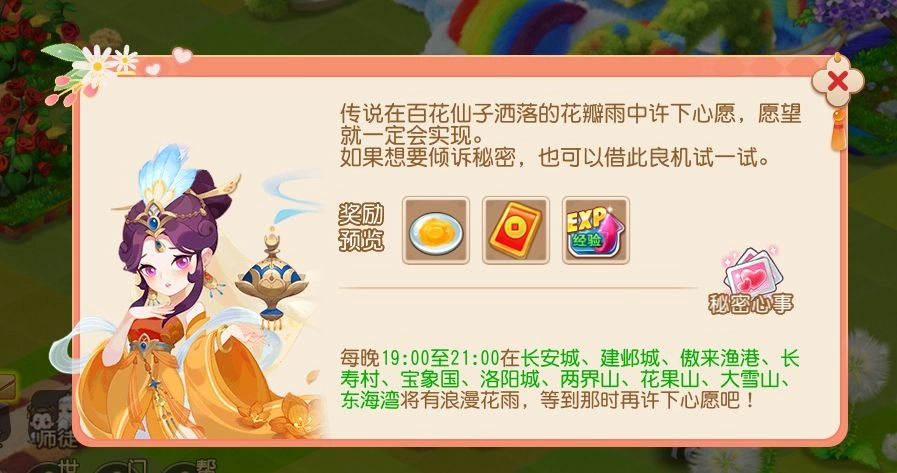 活动期间的每晚七点到九点,小伙伴们只要前往特定场景,就能欣赏到浪漫的花雨特效,还能享受经验雨的奖励加成。另外,要是日常活跃度达到八十,就能获得一个心语花瓣,这个花瓣可以用来许愿,也能用来诉说秘密呢。