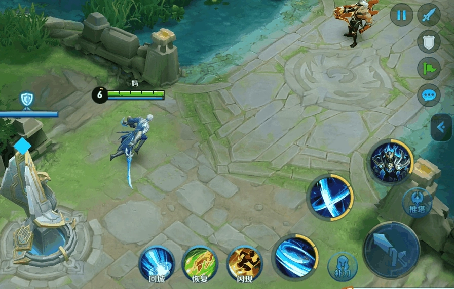 所以要学会利用野怪来快速穿墙,经过测试,在野怪没有移动的情况下,只有蓝buff和蜥蜴背后的墙能够穿过,像野猪背后那么厚的墙是穿不过去的,只能从中间穿。现在来练习一下快速穿墙的操作技巧:拖动轮盘向墙的另一边移动,期间使用二技能,在角色快要碰到墙的时候点击普通攻击(如果周围有其他敌人,点“收割残血”键可以避免砍错),触发【冲砍】效果,来看动图演示:
