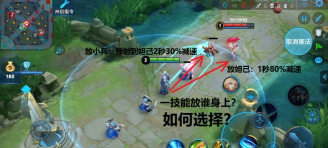 现在需要做个选择:是直接打还是通过弹射来打?我的建议是,面对没有位移和控制技能的对手,直接锁定目标攻击就行;要是对手有控制或位移技能,那就用弹射的方式,也就是攻击这个目标周围的其他目标。为什么这么说呢?对付没位移没控的对手,80%的减速能让他一秒内几乎动不了,足够我们靠近输出;但遇到有位移或控制的对手,就算用80%减速暂时限制他,他也可能直接反控我们或者交位移技能,一秒时间很快就过了,我们还是摸不到他。不过减速效果持续2秒的话,虽然即时效果弱一点,但时间更长,哪怕对手交了控制或位移,我们也有机会在减速持续的时间里靠近他。